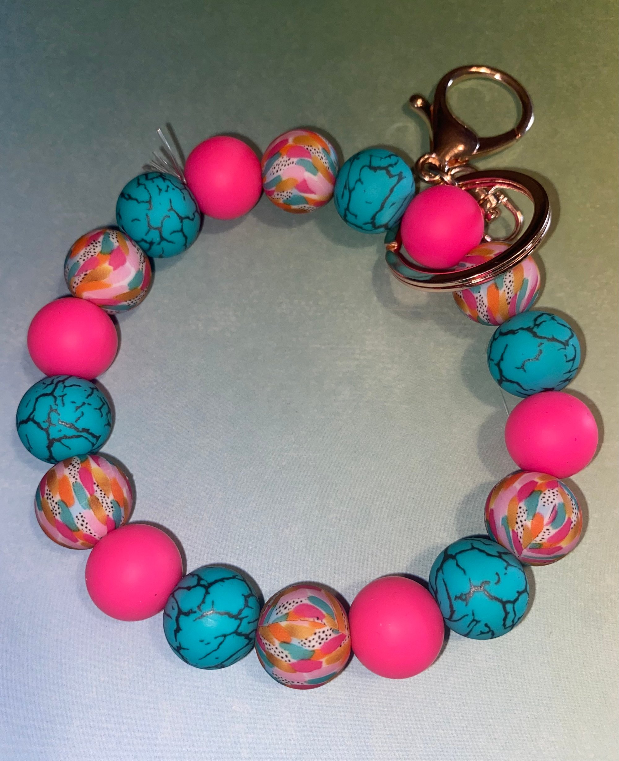 Brighten up your everyday essentials with this bright pink and teal wristlet keychain, handcrafted with high-quality silicone beads. Soft, durable, and comfortable to wear on your wrist, it keeps your keys close while adding a fun pop of color to your day. Stylish, practical, and perfect for everyday use!
