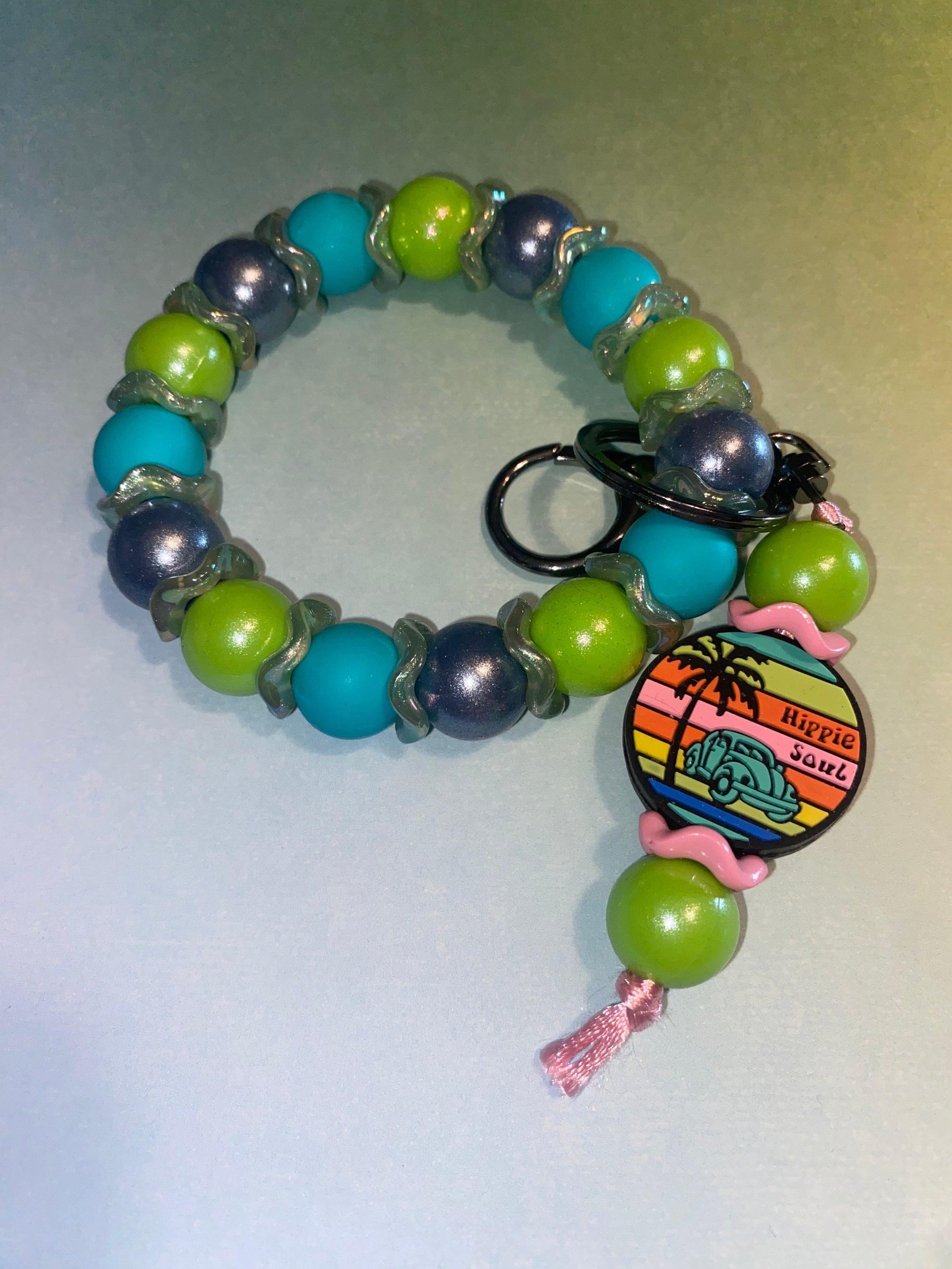 Show off your free spirit with this wristlet keychain featuring a “Hippie Soul” focal bead. Made with high-quality silicone beads, it’s soft, durable, and comfortable to wear on your wrist while keeping your keys close. The fun design and boho-inspired focal bead make it the perfect accessory for any free spirit.